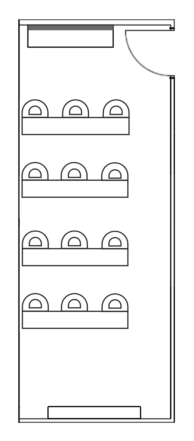 This layout seats up to 20 guests at individual or shared tables, all facing the front of the room for maximum engagement.